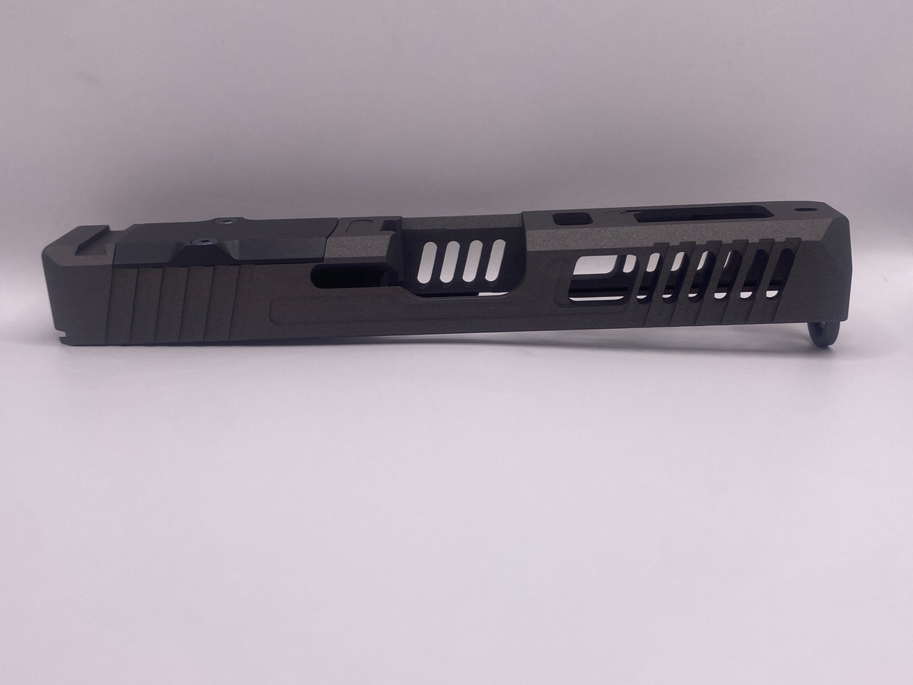 The SM19 Flash Tungsten Stripped Slide delivers precision machining and a durable Tungsten Cerakote finish for Glock 19 builds. Machined in the USA from certified 17-4 stainless steel, finished in-house, and designed with a window cut for reduced mass and ported barrel compatibility. RMR optic ready and engineered for long-lasting reliability.