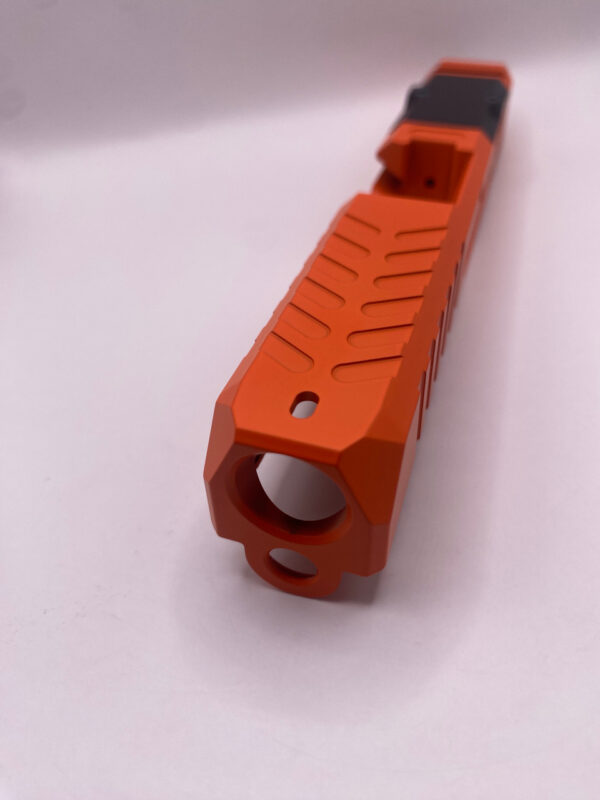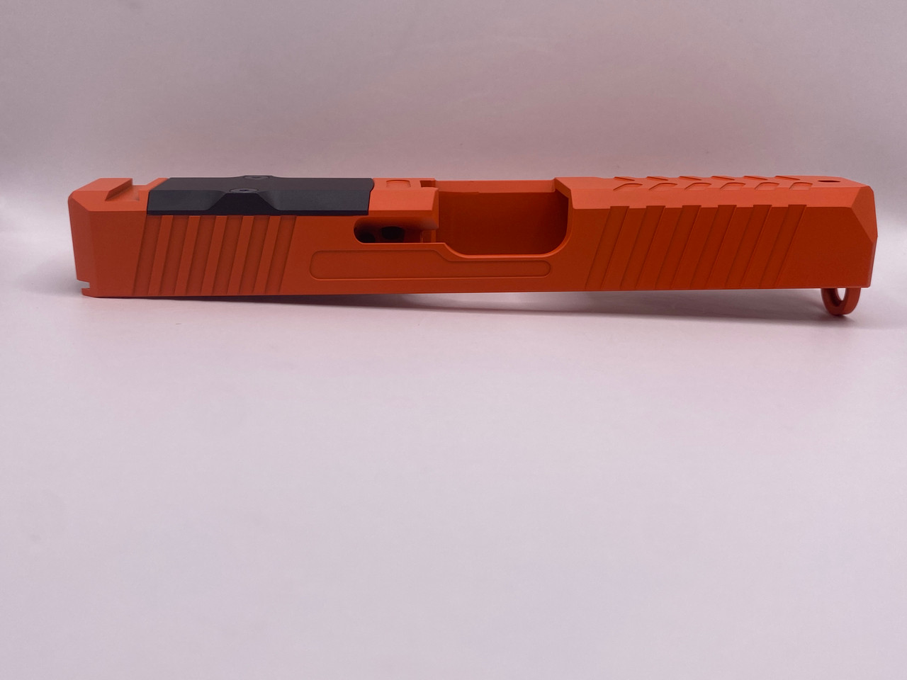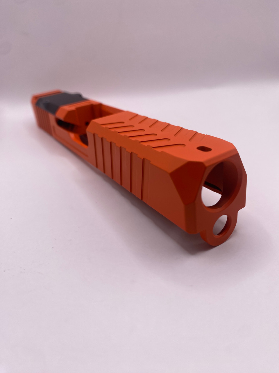 Turn heads and perform with the SM19 Helot Hunter Orange Stripped Slide from Stiffler Manufacturing. This American-made slide brings bold style, tactical function and rugged reliability to your custom Glock-style build.