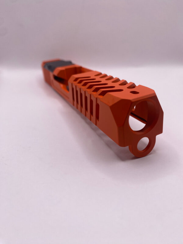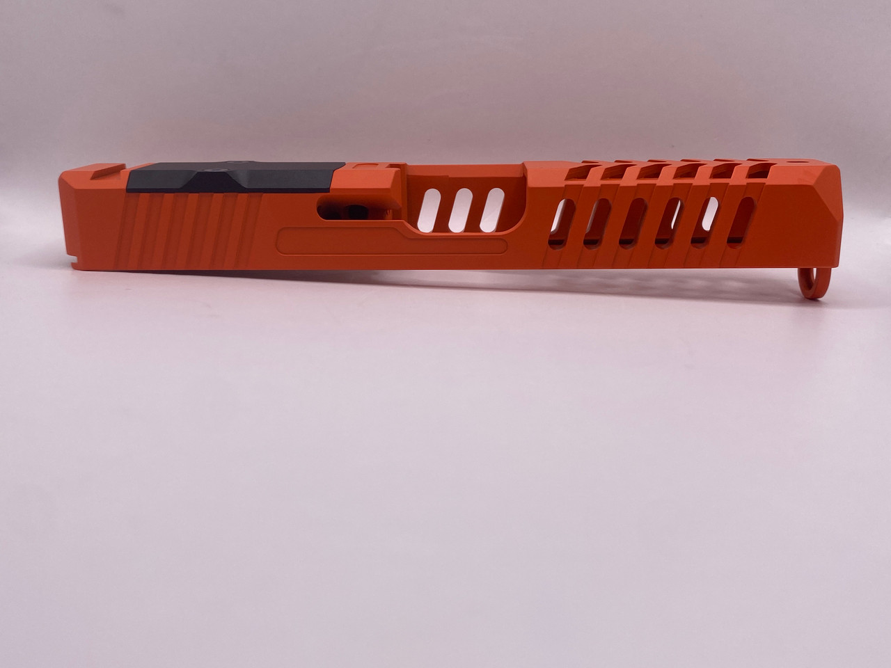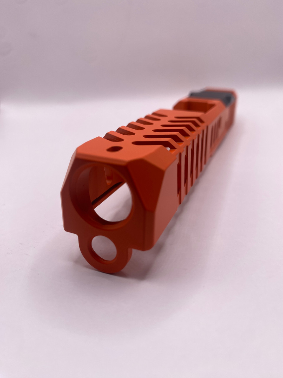 Unleash the beast with the SM19 Leonidas Hunter Orange Stripped Slide by Stiffler Manufacturing. For serious Glock-style builders only, this slide is strong, bold and machined to perfection.