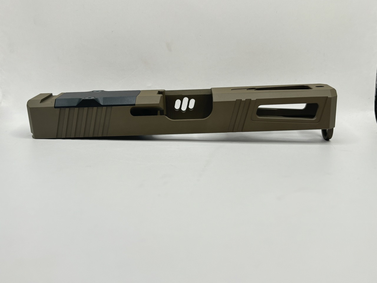 The SM19 Viper Flat Dark Earth (FDE) Stripped Slide delivers precise engineering and a robust FDE Cerakote finish for Glock 19 builds. Machined in the USA from certified 17-4 stainless steel, finished in-house, and designed with a window cut for reduced mass and ported barrel compatibility. RMR optic ready and built for enduring performance.