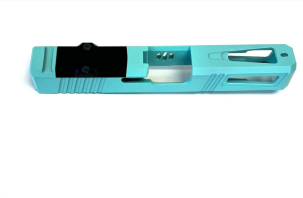 The SM19 Viper Robin’s Egg Blue (REB) Stripped Slide offers precision and standout style for Glock 19 builders. Machined in the USA from certified 17-4 stainless steel, finished with in-house Robin’s Egg Blue Cerakote, and designed with a window cut for reduced mass and ported barrel compatibility. RMR optic ready and engineered for long-term reliability.
